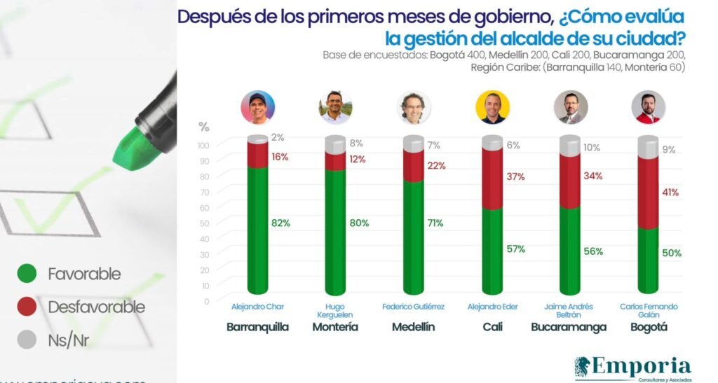 El estudio, que evaluó la gestión de seis alcaldes durante sus primeros meses de gobierno, ubica a Kerguelén solo por debajo del alcalde de Barranquilla, Alejandro Char (82%), y por encima de Federico Gutiérrez de Medellín (71%), Alejandro Eder de Cali (57%), Jaime Andrés Beltrán de Bucaramanga (56%) y Carlos Fernando Galán de Bogotá (50%).