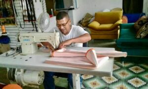 En el municipio de Villanueva, situado al norte de Bolívar, reside Teófilo Alcázar Palacio, popularmente conocido como “El Teo”.  Un artesano empírico con más de 15 años de experiencia, se destaca por su habilidad para crear artesanías funcionales o decorativas a través del trabajo hecho a mano. Desde pequeño, mostró su interés por el arte, cuenta que su madre, Ilda, tenía una máquina de cocer y allí dio sus primeros pasos. Luego, se forjó como ayudante con su tío Blasides, quien tapizaba los cojines de los buses en Cartagena, principalmente a los de la ruta Blas de Lezo. Eso en cuanto a la tapicería, del resto de manualidades las aprendió en “La universidad de la calle” cuando decidió ser independiente montando su propio local al que le puso por nombre “Teo Kit” y brinda servicios de reparación de muebles, juegos de sala y comedor, mecedoras, somieres, cojines para autos y motos, parasoles, bolsos, morrales, forros y estuches.  Sin embargo, en los tiempos libres se dedica a hacer otro tipo de creaciones, entre ellas su obra maestra, el abanico de madera eléctrico totalmente funcional. “La idea empezó cuando estaba sin hacer nada y vi un montón de madera cortada, entonces cada que tenia tiempo libre poco a poco lo perfeccionaba”, acotó Alcázar Palacio. El abanico, se compone en su mayoría por madera, obviando las partes eléctricas que lo hacen funcional, asimismo, usa cáscaras de totumo para proteger los circuitos eléctricos y bejucos que gracias a su flexibilidad y resistencia actúan como rejillas.  El manualista, considera que la duración estimada para la elaboración es de una a dos semanas y que el costo del mismo puede variar debido a que la materia prima en el sector artesanal es cambiante siendo permeada por la inflación u otros factores. También asegura, que la materia prima y las herramientas son complementarias al talento, por ello, hace un llamado a que las autoridades pertinentes brinden la ayuda necesaria para llegar a manualidades de mayor escala. “Falta una proyección a nivel gubernamental, una ayuda, condonaciones y préstamos para evolucionar en el negocio”, expresó “El Teo”. Para los amantes de este tipo de creaciones y quienes requieran los servicios de reparación y restauración mencionados anteriormente, pueden contactarlo vía Whastapp al 3024056597.