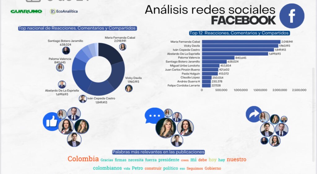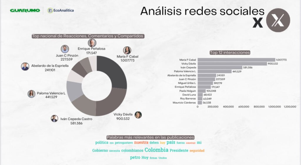 Según el informe de Guarumo, Cabal ocupa el primer lugar en seguidores e interacciones en Facebook y X (antes Twitter), superando el millón de reacciones en un solo mes, lo que evidencia un sólido respaldo ciudadano y una estrategia digital altamente efectiva. Su discurso enfocado en la defensa de la Fuerza Pública, la crítica a la inseguridad y la promoción de la economía productiva la posicionan como una de las voces más consistentes dentro del espectro de oposición