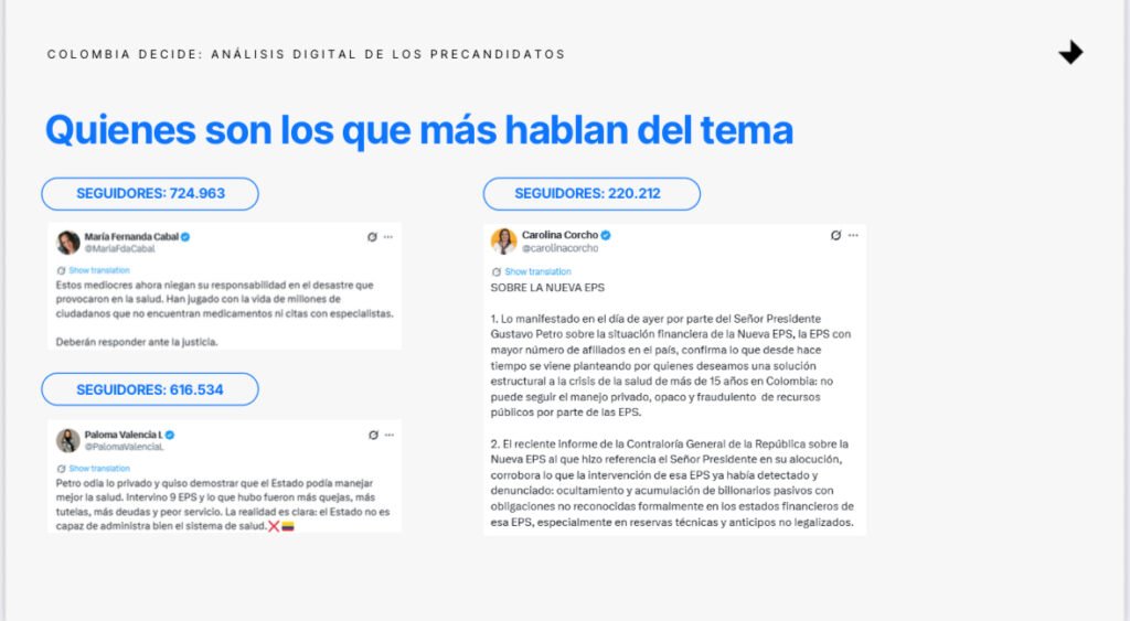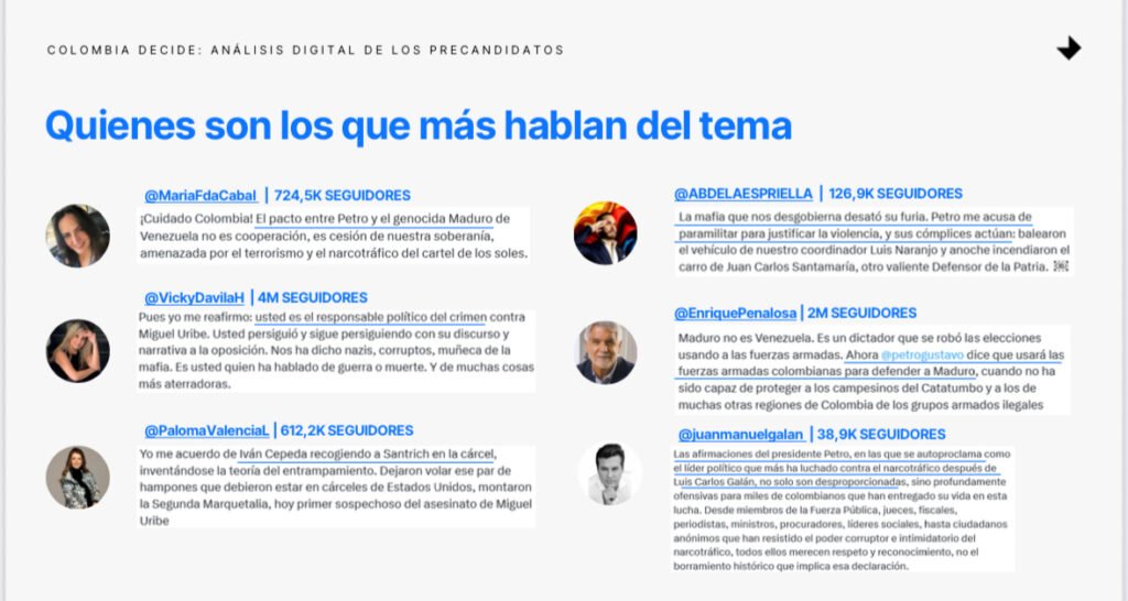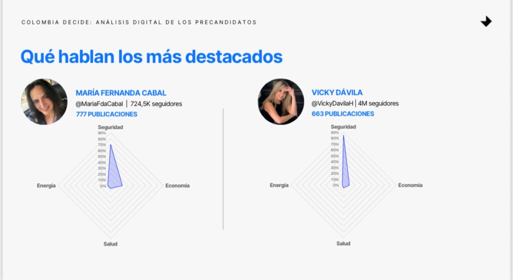 El análisis de Edelman Colombia también resalta que María Fernanda Cabal se encuentra entre los precandidatos con mayor número de publicaciones e interacciones en temas de seguridad y salud, ocupando el primer lugar en volumen de conversación frente a otros aspirantes de derecha y centro. Su presencia digital se asocia a narrativas de liderazgo, autoridad y orden, con un tono de firmeza que ha conectado especialmente con audiencias urbanas y jóvenes inconformes con la situación actual del país
